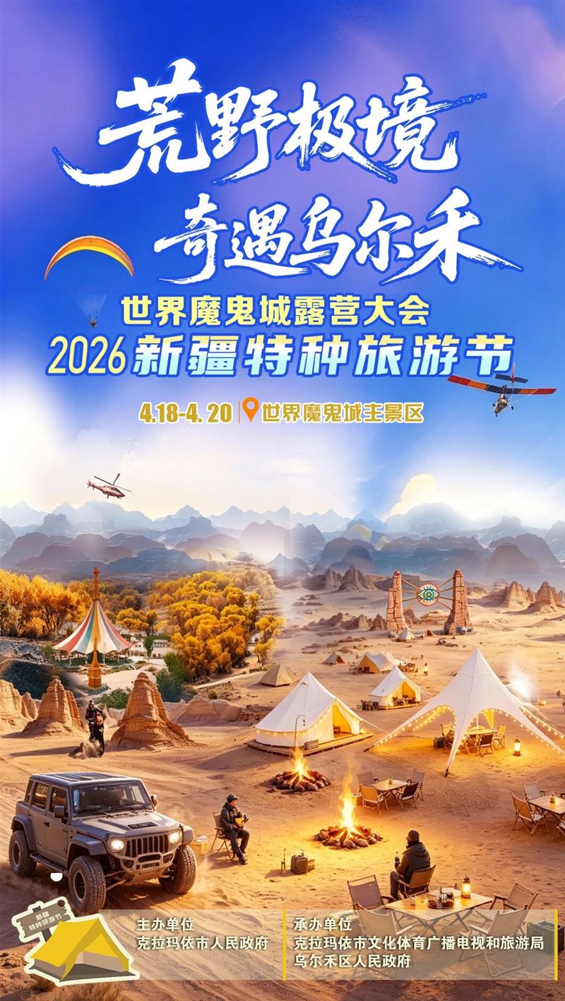 4月18日至20日,“荒野极境 奇遇乌尔禾”2026新疆特种旅游节将在克拉玛依市乌尔禾区世界魔鬼城景区举办。