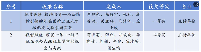 2026年3月,2025年新疆维吾尔自治区教学成果奖获奖项目名单正式公布。以新疆第二医学院为第一完成单位的两项教学成果成功入选,其中一等奖1项、二等奖1项,取得了新疆第二医学院在该奖项上的历史性新突破。